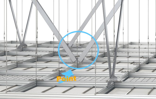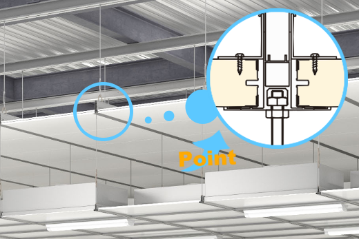 当社独自の取り組みとして、システム天井を吊り下げる際に、パネル天井へボルトを貫通させない構造を開発しました。