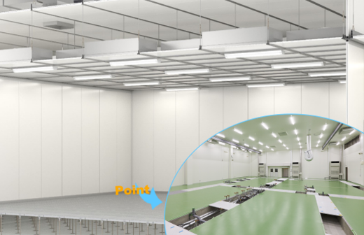 当社ではパネル工法のメリットを保ちながら、独自のシステム天井を開発することで、高い清浄度を保つ垂直層流方式に対応したクリーンルーム構築を可能にしました。